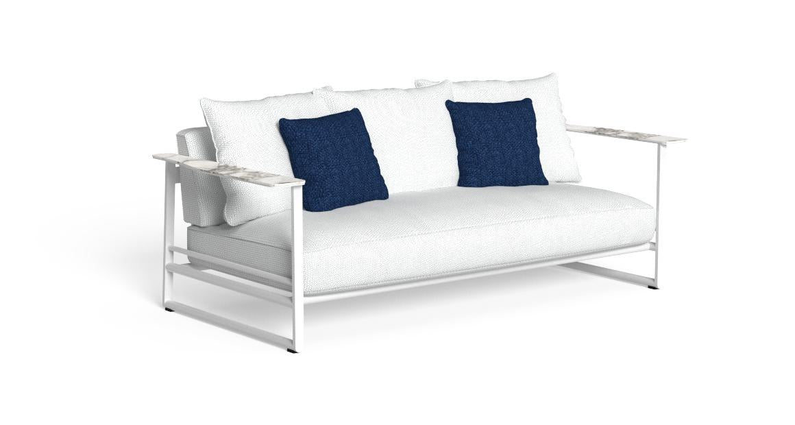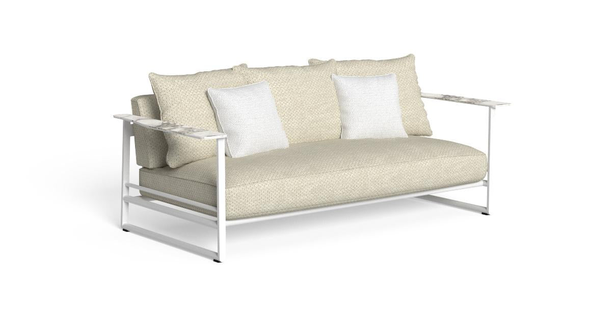 Le canapé de jardin Riviera, épuré et lumineux, s'adaptera parfaitement à un salon d'extérieur. Son design raffiné est renforcé par l'utilisation d'aluminium pour la structure. Les coussins déhoussables sont constitués de mousse quick dry foam et recouverts de tissu résistant.