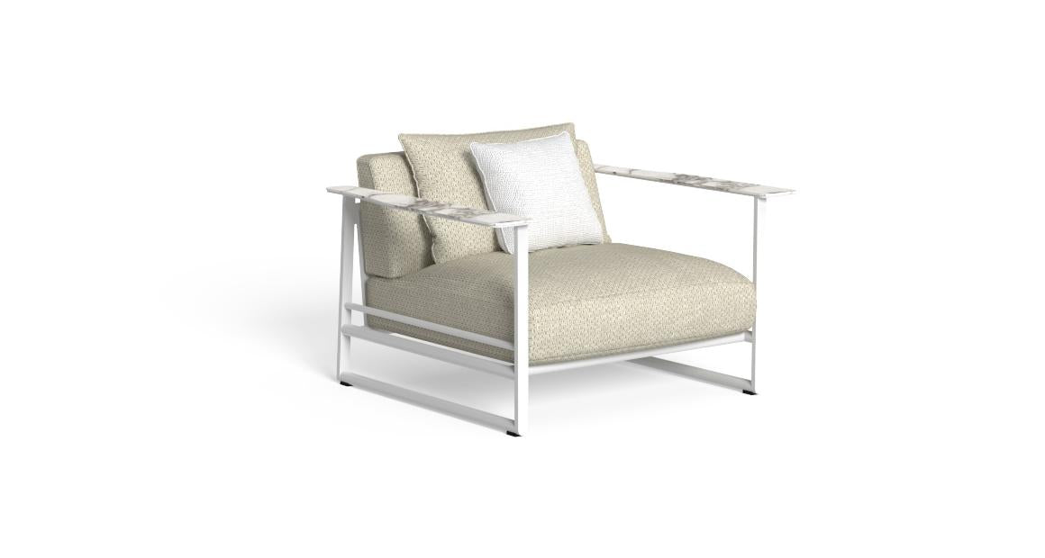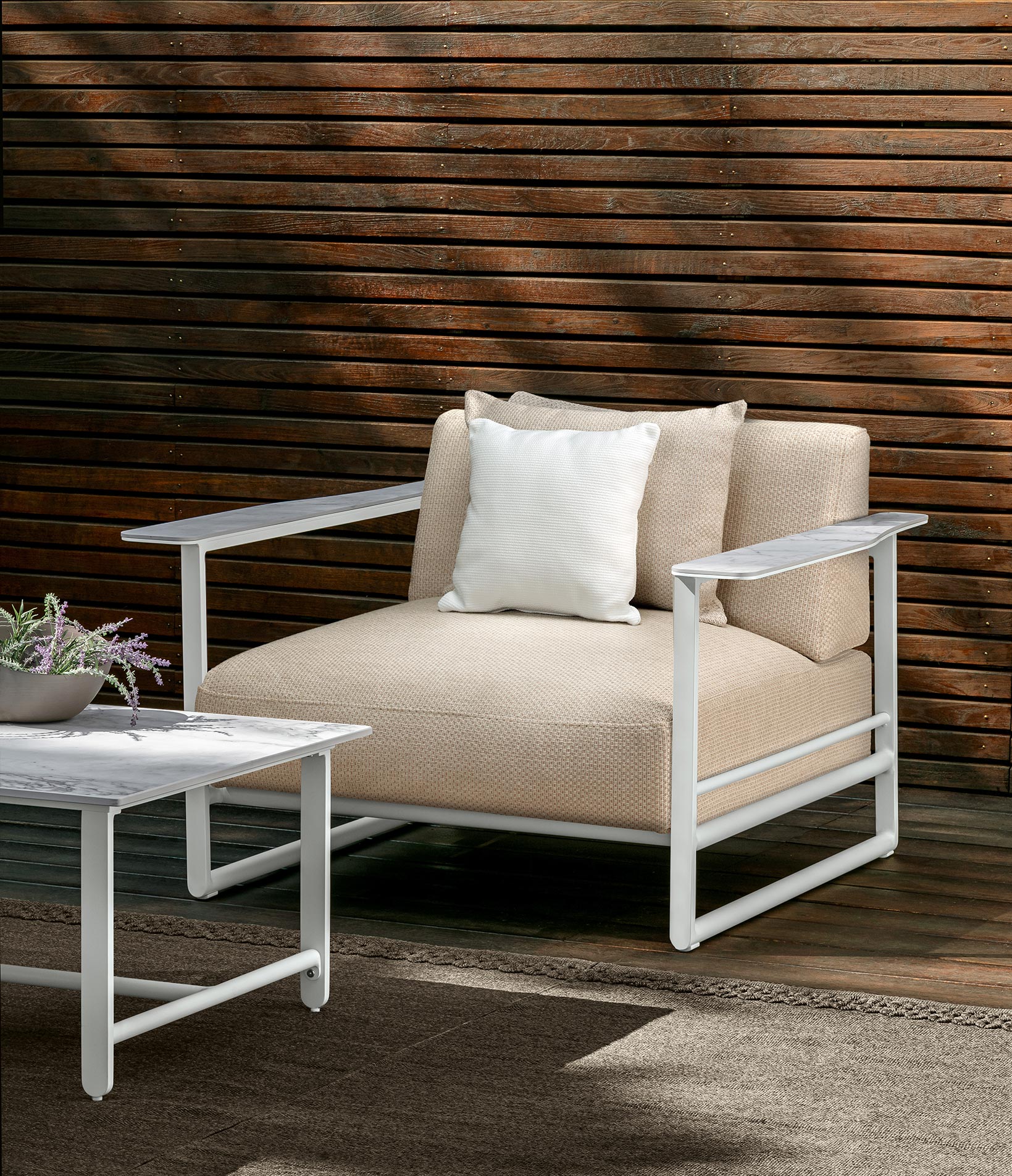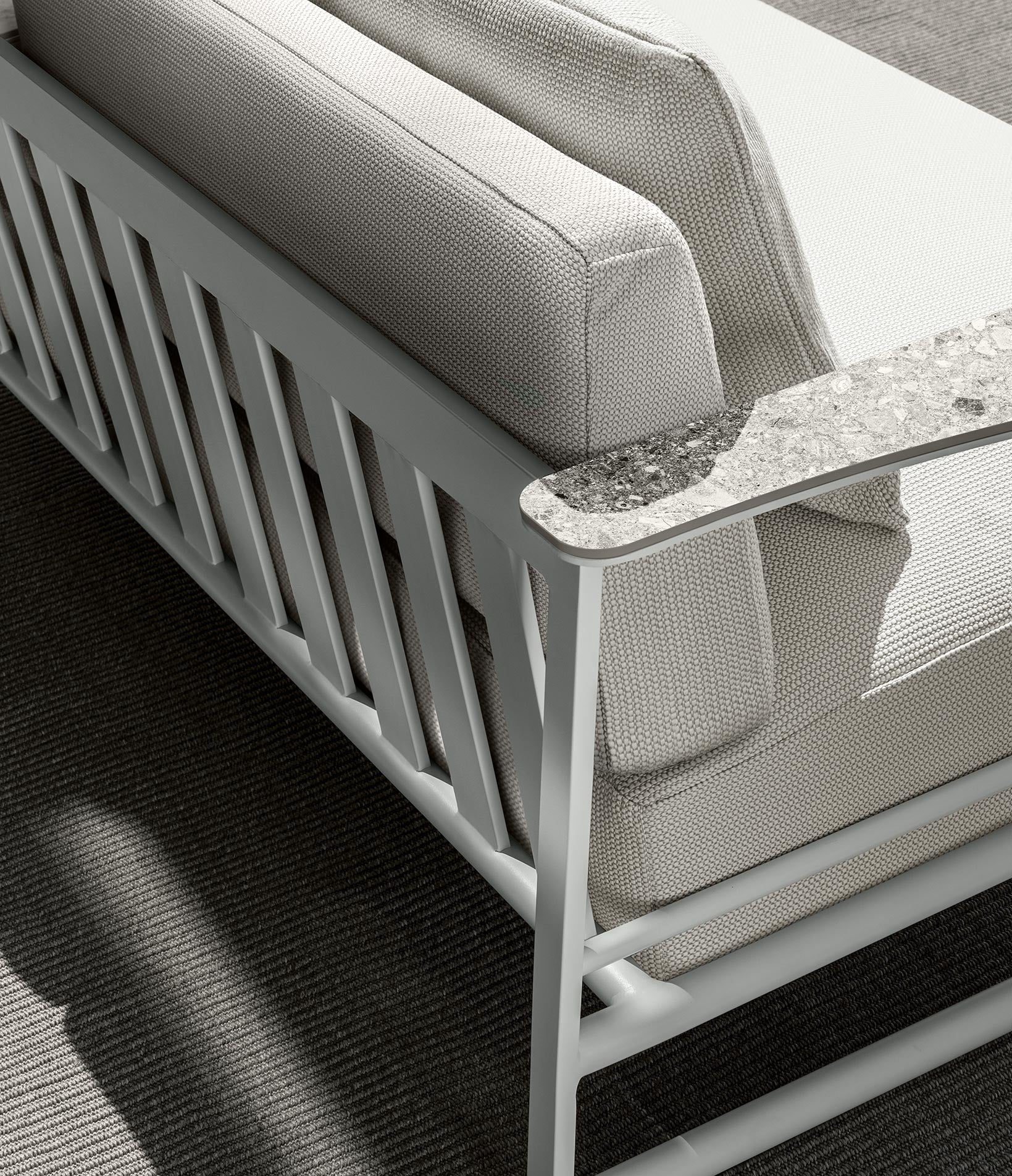 Le fauteuil living Riviera est doté d'une assise profonde et enveloppante propice au repos et à la relaxation. Sa structure en aluminium met en exergue les généreux coussins rehaussés par la texture épaisse des fils. Les accoudoirs en grès confèrent une sophistication supplémentaire à l'ensemble. C’est un incontournable pour valoriser votre espace extérieur.