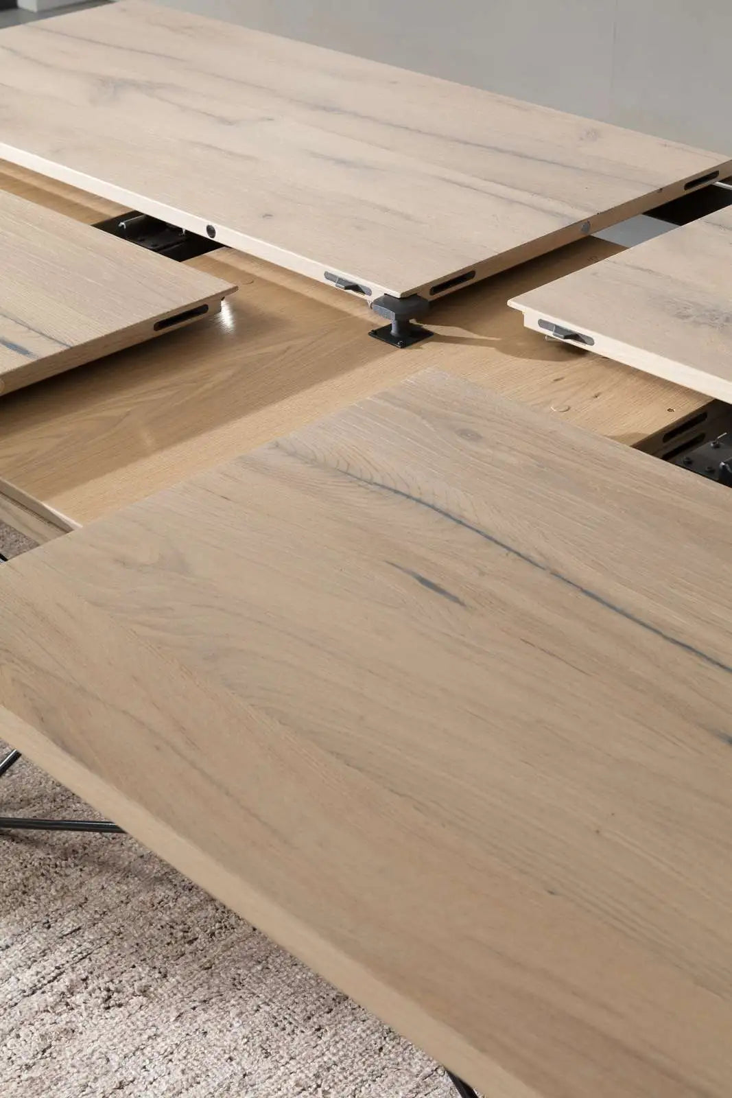 Cette table industrielle extensible de 12 personnes est dotée d'une base en métal robuste avec des plateaux et des rallonges en vieux chêne naturellement fini. La marqueterie centrale accentue l'authenticité du bois tout en lui ajoutant une touche contemporaine. Les glissières de guidage sont également en métal, assurant une ouverture et une fermeture en douceur. Les pieds réglables en hauteur permettent un ajustement facile pour convenir à tous les sols.